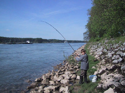 einer unserer größten Flüsse mit einer meist sehr kräftigen und schnell fließenden Strömung. Hier wird der Angler gezwungen zu starkem Gerät zu greifen, wenn er denn Erfolg haben möchte. Nur an wenigen stellen ist das fischen mit der Posen-Montage möglich, mit Ausnahme beim Stippfischen, doch dies ist nicht die Posenfischerei wie sie viele von uns mögen, sie dient meist dem Wettkampf- fischen. Meiner Meinung nach ist die Erfolgreichste Methode, das Fischen mit dem Futterkorb (Feedern), hierbei kann dem Angler fast jeder Fisch an den Haken gehen. Jedoch sollte man Futterkörbe ab 80-100gr aufwärts in seinem Sortiment mit sich führen. Ich selbst bevorzuge Futterkörbe mit 180-200gr. wenn ich an der Strömungskante fische, auch benutze ich nicht die meist Typich verwendeten Feederuten, da ich der Meinung bin das diese, trotz angegebenem Wurfgewicht von weit mehr als 150gr, mit diesen Gewichten überfordert sind, gerade wenn es darum geht große Distanzen zu bewältigen. Für diese Zwecke habe ich meine 3Lbs Karpfenruten Zweck entfremdet, o.k. man muss schon die Spitze genau im Auge haben um auch zaghafte Bisse erkennen zu können. Doch habe ich längst den vorteil der starken Ruten für mich entdeckt, von 10 Barben, sind bestimmt 3-4 an Brust oder Rückenflosse gehackt und wer einmal eine 70cm Barbe an der Rückenflosse erwischt hat und diese auch noch aus der Fahrrinne Pumpen muss, weiß von was ich rede. Oftmals glaubte ich schon an Kapitale Karpfen oder gar an einen Wels, da der Strömungs- Druck in Verbindung mit dem Eigengewischt des Fisches, dem Angler schon einen erheblichen Wiederstand an der Rute bietet.